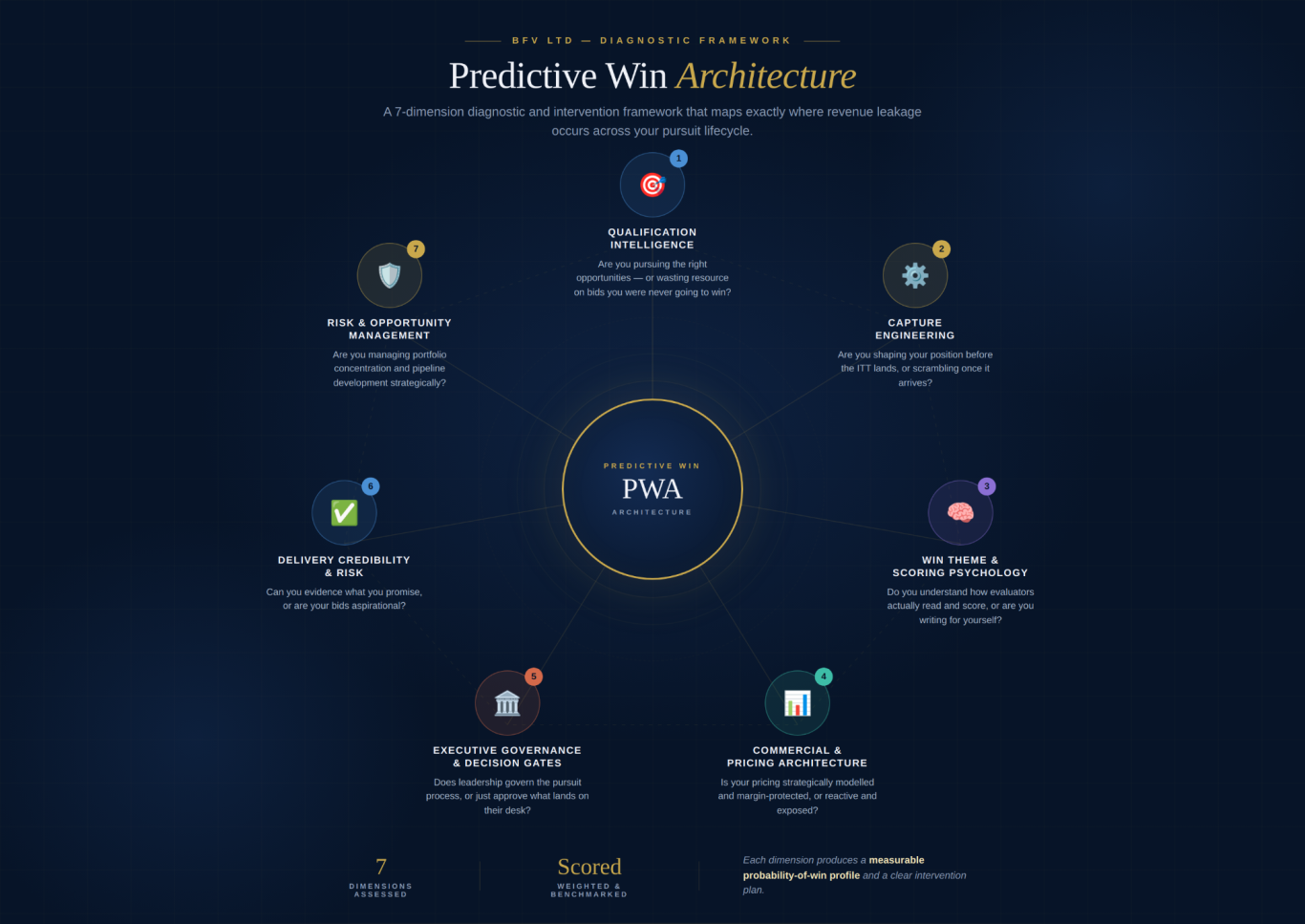 Every failed bid has a cause. Most organisations just can't see it. We built Predictive Win Architecture to make the invisible visible, a 7-dimension diagnostic that maps exactly where revenue leakage occurs across your pursuit lifecycle.