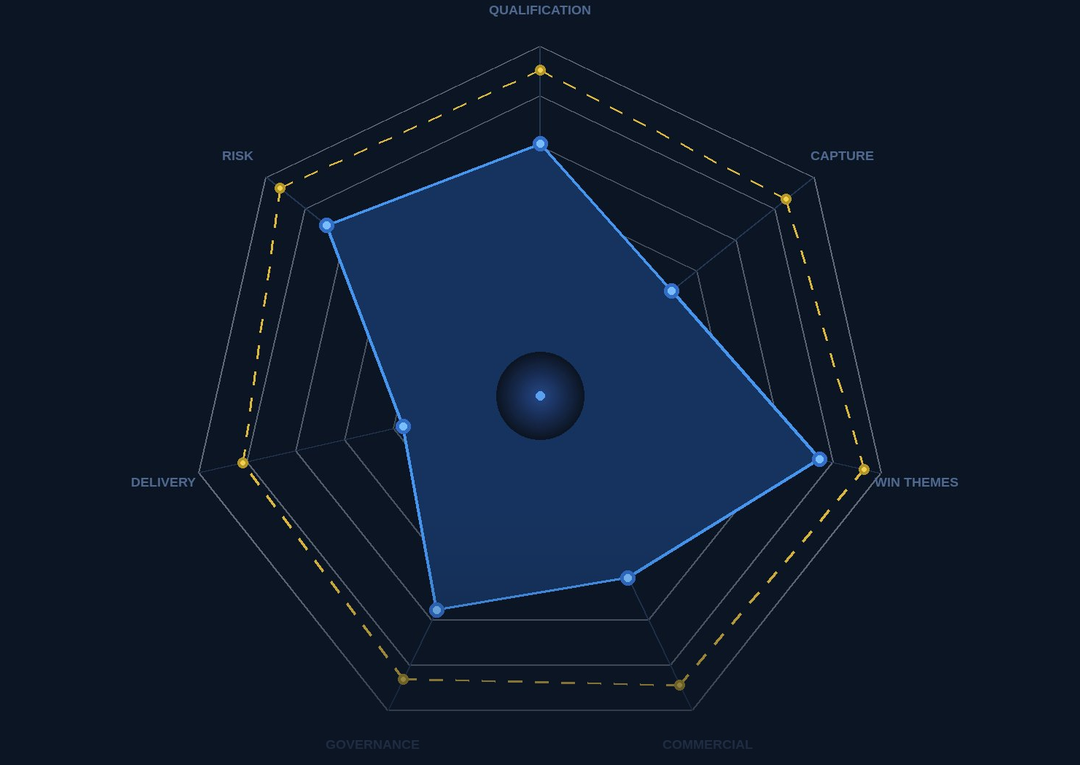 Each dimension is scored, weighted, and benchmarked to produce a measurable probability-of-win profile and a clear intervention plan.