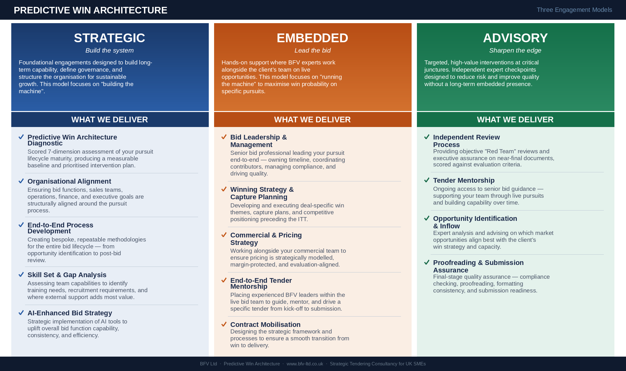BFV’s engagement model is deliberately structured around three clear engagement tiers: Strategic, Embedded, and Advisory, allowing clients to invest at the level that best matches their organisational maturity, internal capability, and immediate commercial objectives. Whether building long term bid infrastructure, strengthening live pursuits, or securing independent assurance at critical stages, each tier is designed to deliver measurable uplift without unnecessary overhead. This structured approach ensures cost effectiveness: clients pay for the level of intervention required, not a one-size-fits-all consultancy model.