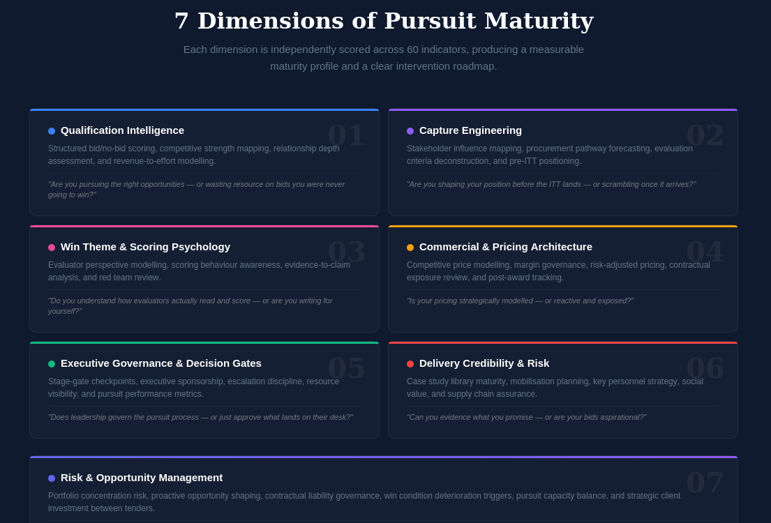 PWA assesses your entire pursuit lifecycle across seven dimensions, from how you identify opportunities to how you govern the decision to bid, how you build win strategies, how you price, and how you evidence delivery credibility.