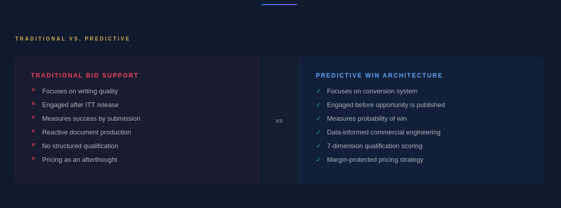 Each dimension is scored, weighted against your pipeline profile, and benchmarked to produce two things: a measurable probability-of-win profile across your active and future pursuits, and a prioritised intervention plan that tells you exactly where to focus.
