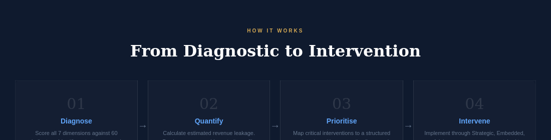 It is not a maturity model you file and forget. It is a working diagnostic that connects directly to revenue.