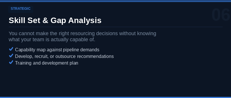 Every deliverable below sits within one of our three engagement models Strategic, Embedded, or Advisory. Each one exists because we've seen the problem it solves cost organisations real revenue.