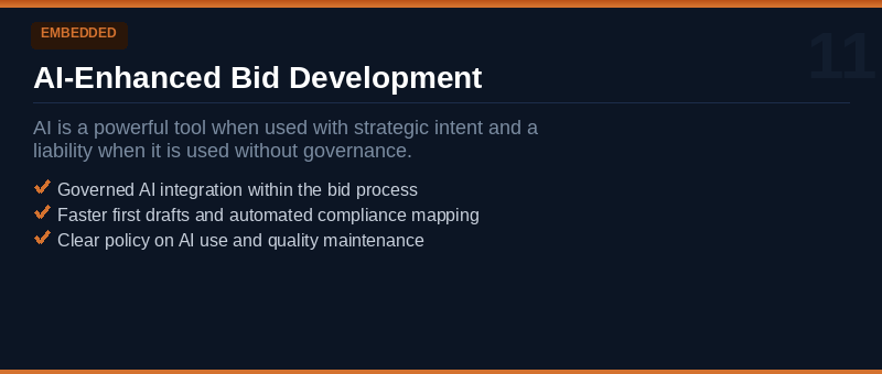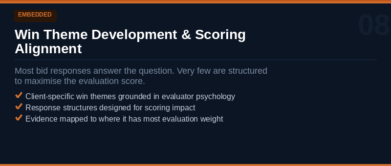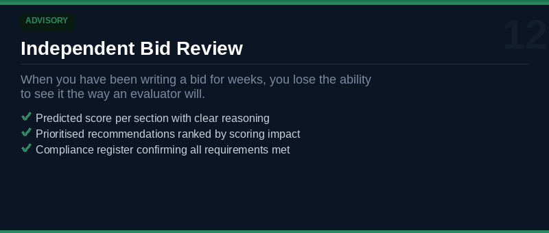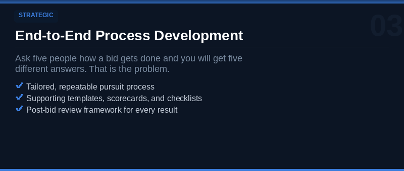 Not sure where to start? Most clients begin with a Strategic Bid Review, a focused conversation about your pipeline, your win rate, and where the gaps are. From there, we recommend the engagement model that fits your situation and your budget.